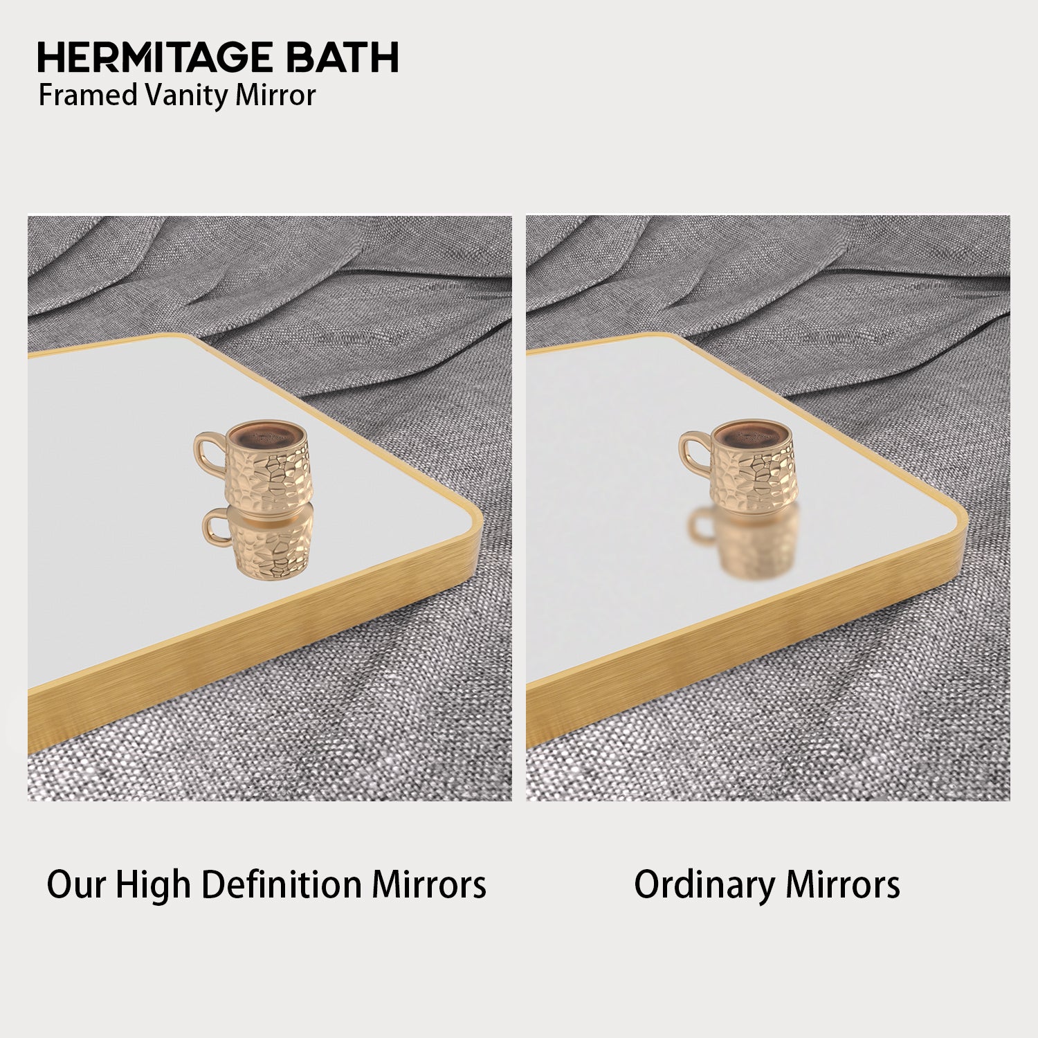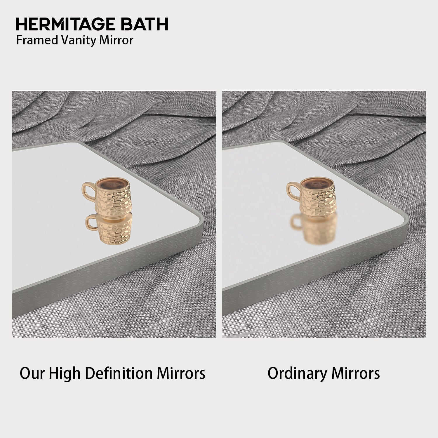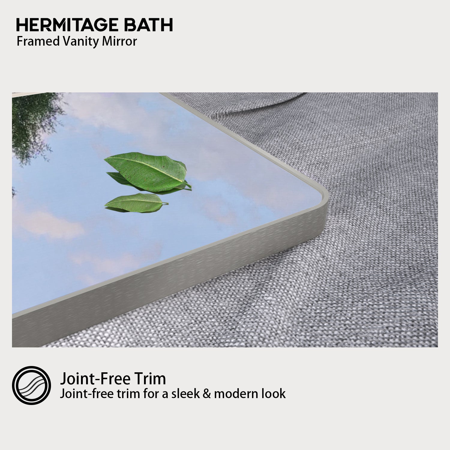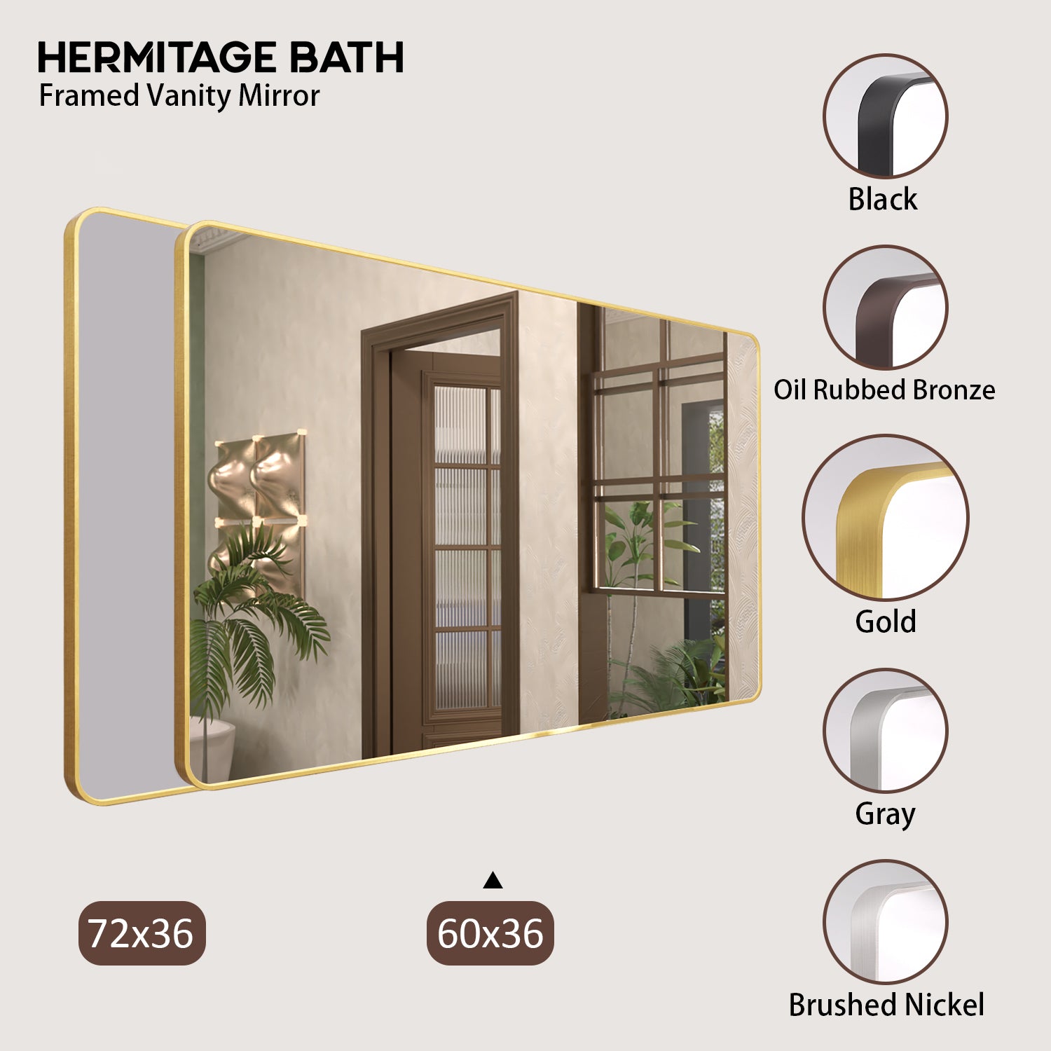 If you seek elegance and American traditional style in your bathroom, consider the Hermitage Bath Classic Framed Vanity Mirror Collection. This collection offers sophisticated colors: Brass, Green, Matte Black, and Oil Rubbed Bronze. Each mirror features a durable, clear, copper-free silver surface. The frames, made of refined anodized aluminum, ensure elegance and durability. Embrace the luxury of Hermitage Bath, where timeless beauty and American style enhance your daily routineBath.