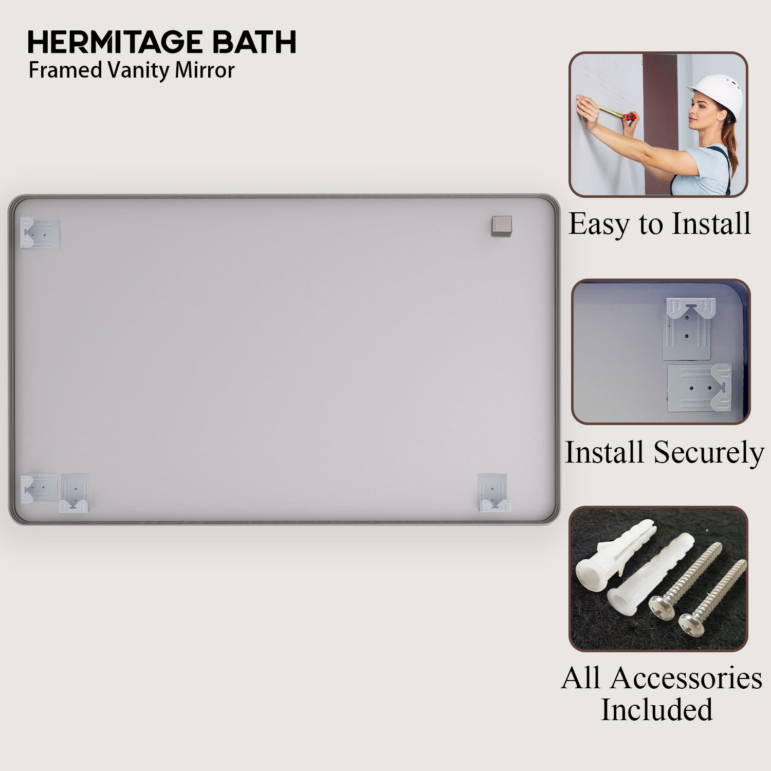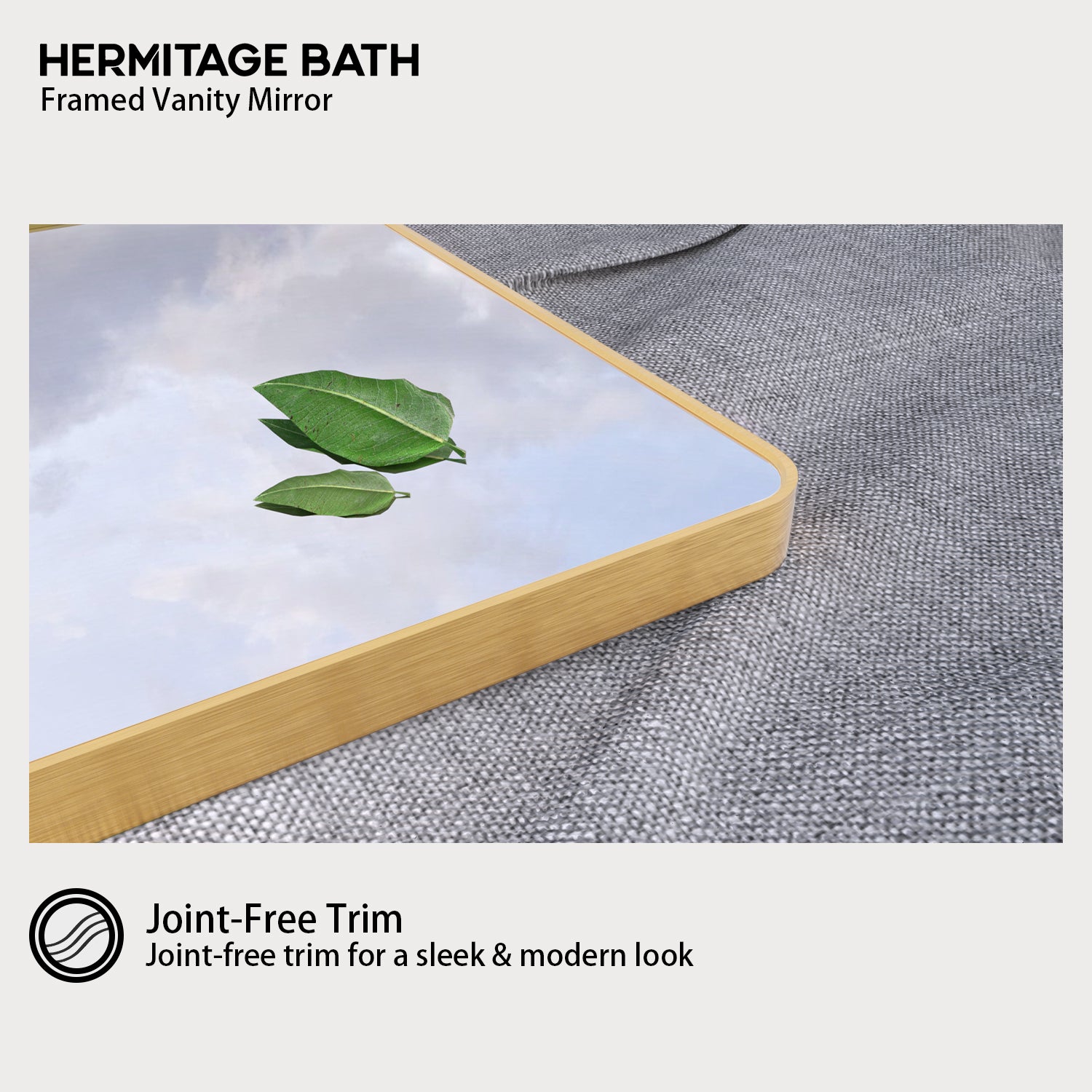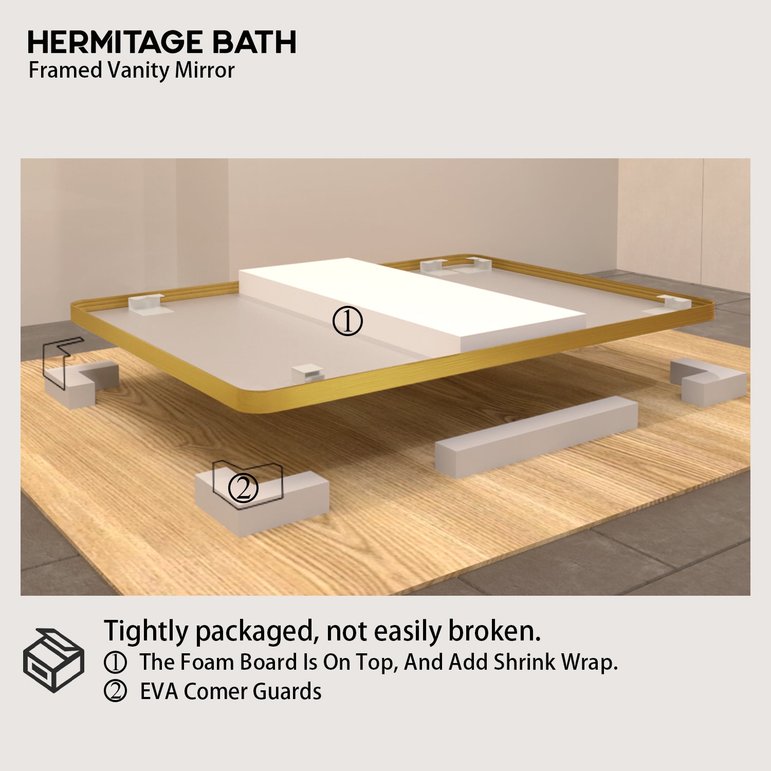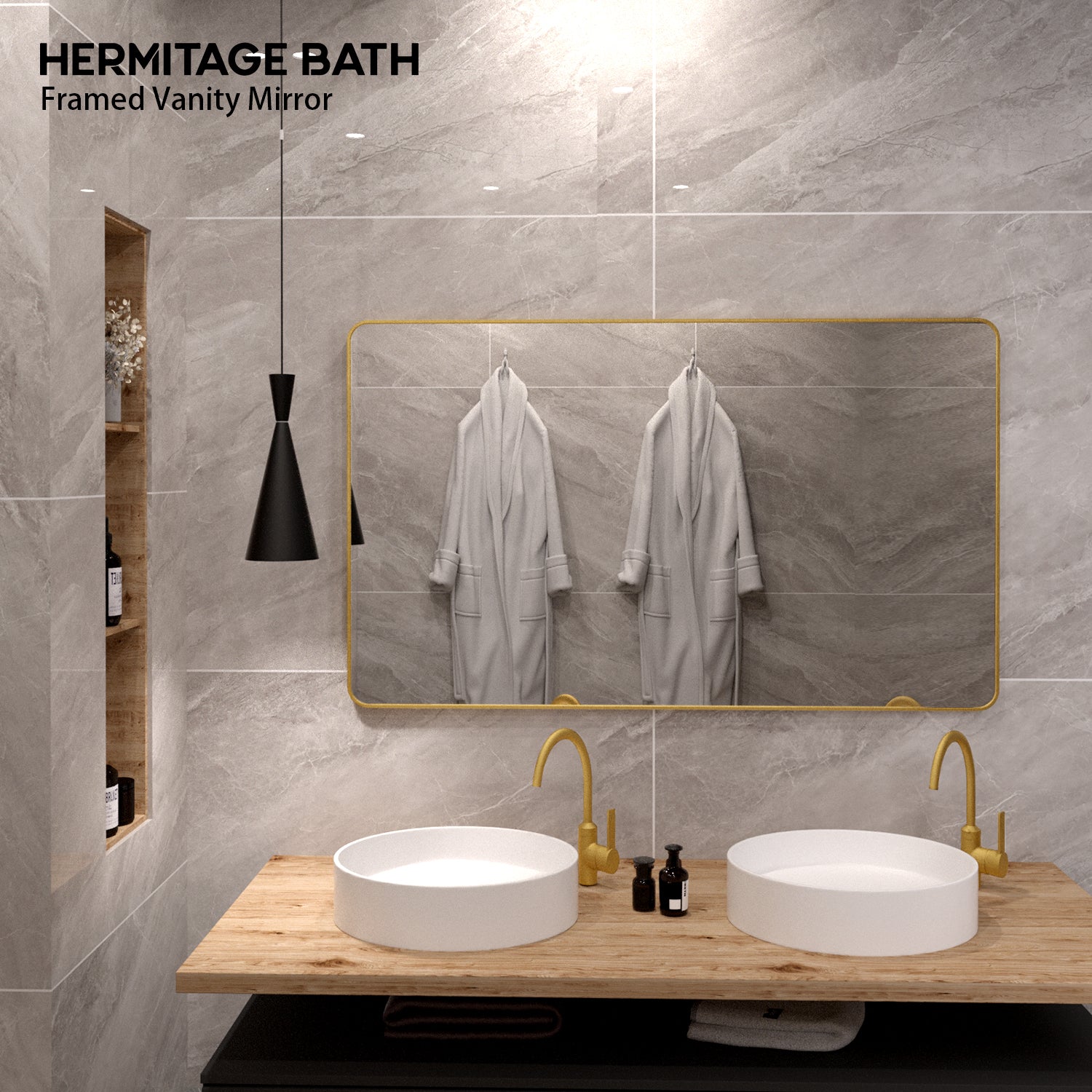 If you seek elegance and American traditional style in your bathroom, consider the Hermitage Bath Classic Framed Vanity Mirror Collection. This collection offers sophisticated colors: Brass, Green, Matte Black, and Oil Rubbed Bronze. Each mirror features a durable, clear, copper-free silver surface. The frames, made of refined anodized aluminum, ensure elegance and durability. Embrace the luxury of Hermitage Bath, where timeless beauty and American style enhance your daily routineBath.