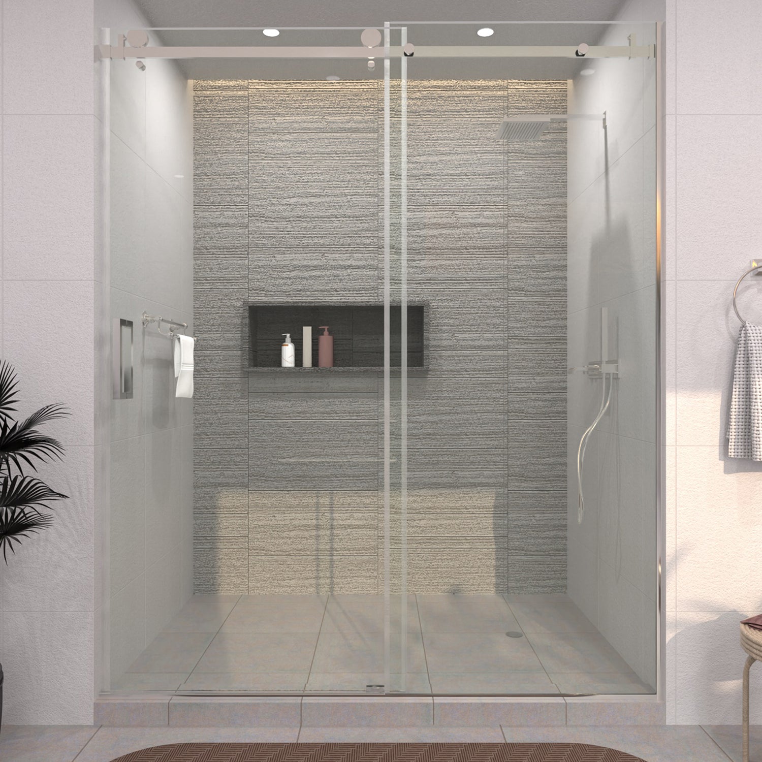 2: | Designed to perfection, Eletta collection of sliding shower door spans from 56 inches to 60 inches in width and stands tall at 76 inches, delivering a grand and luxurious presence. |