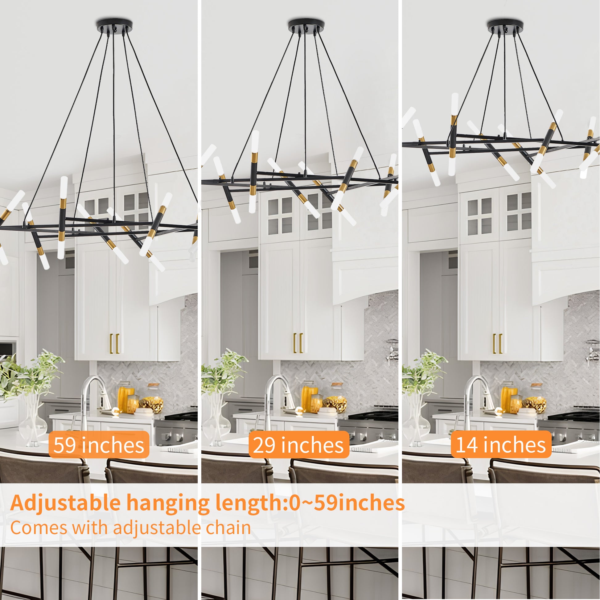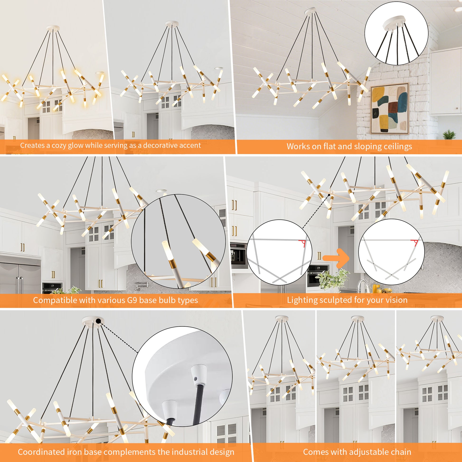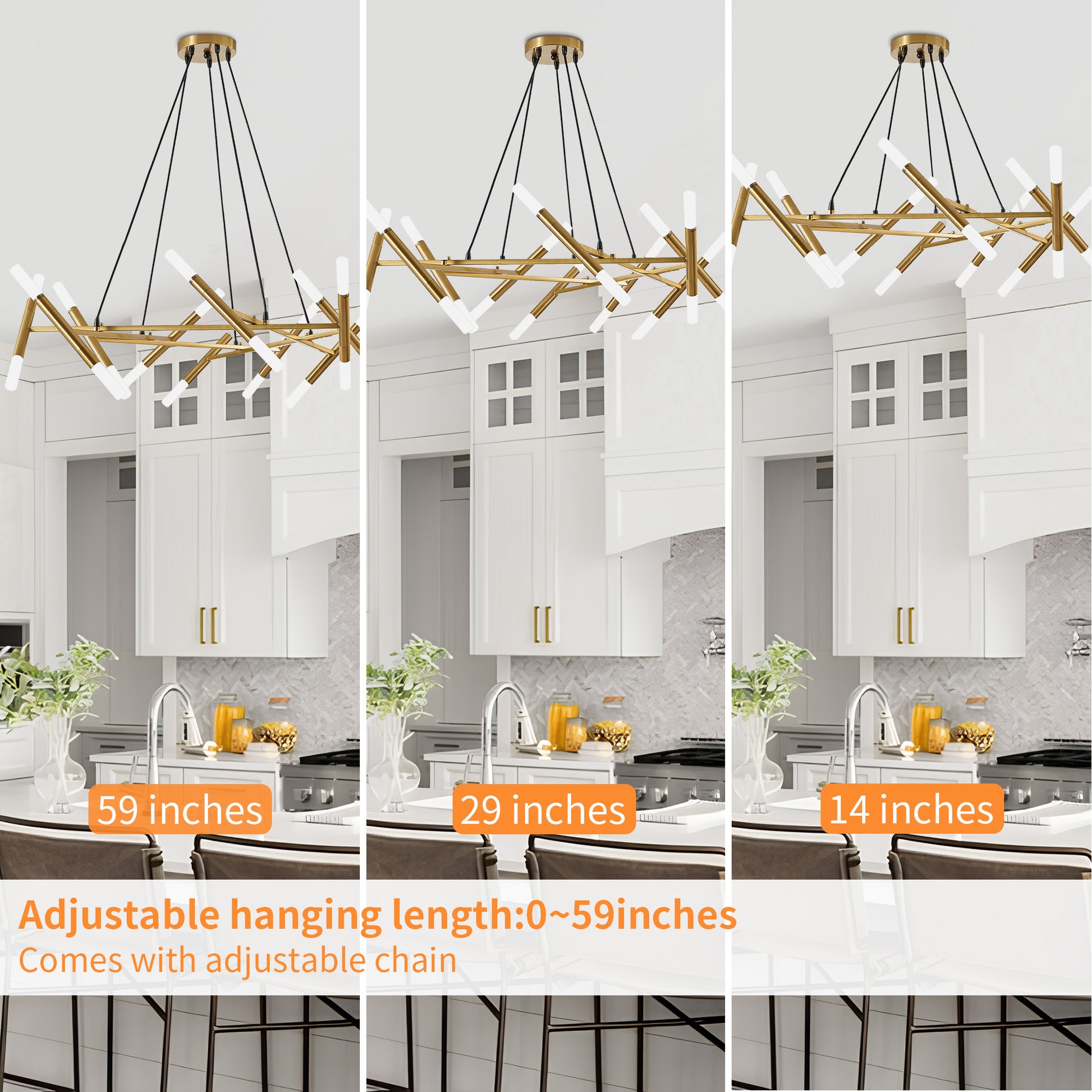 TaiMei 41" Golden Modern Chandelier merges minimalist branch design with matte gold accents, creating a sleek centerpiece for dining rooms, living rooms, or kitchen islands. Crafted from rust-resistant metal and frosted acrylic shades, its durable construction withstands daily wear while diffusing warm, gallery-style lighting. The adjustable black cords adapt to most US ceiling heights, complemented by energy-efficient G9 bulb compatibility (20x3W, 2700K recommended). The adjustable chain ensures the perfect fit for any ceiling height, and installation is quick and easy with clear instructions.UL-certified hardwired design ensures safety, ideal for homes or boutique cafes.