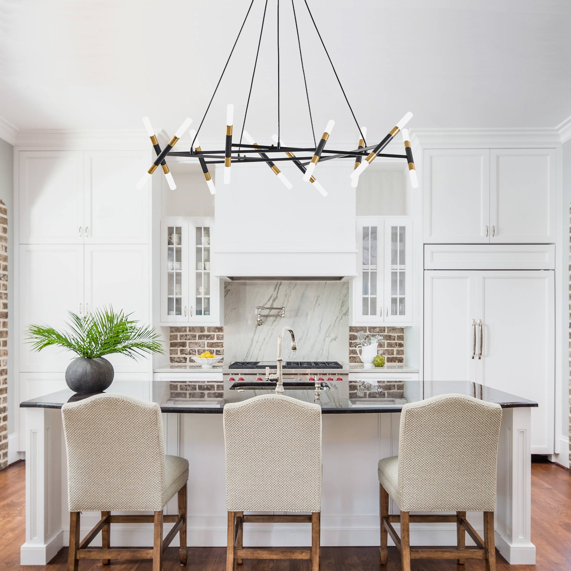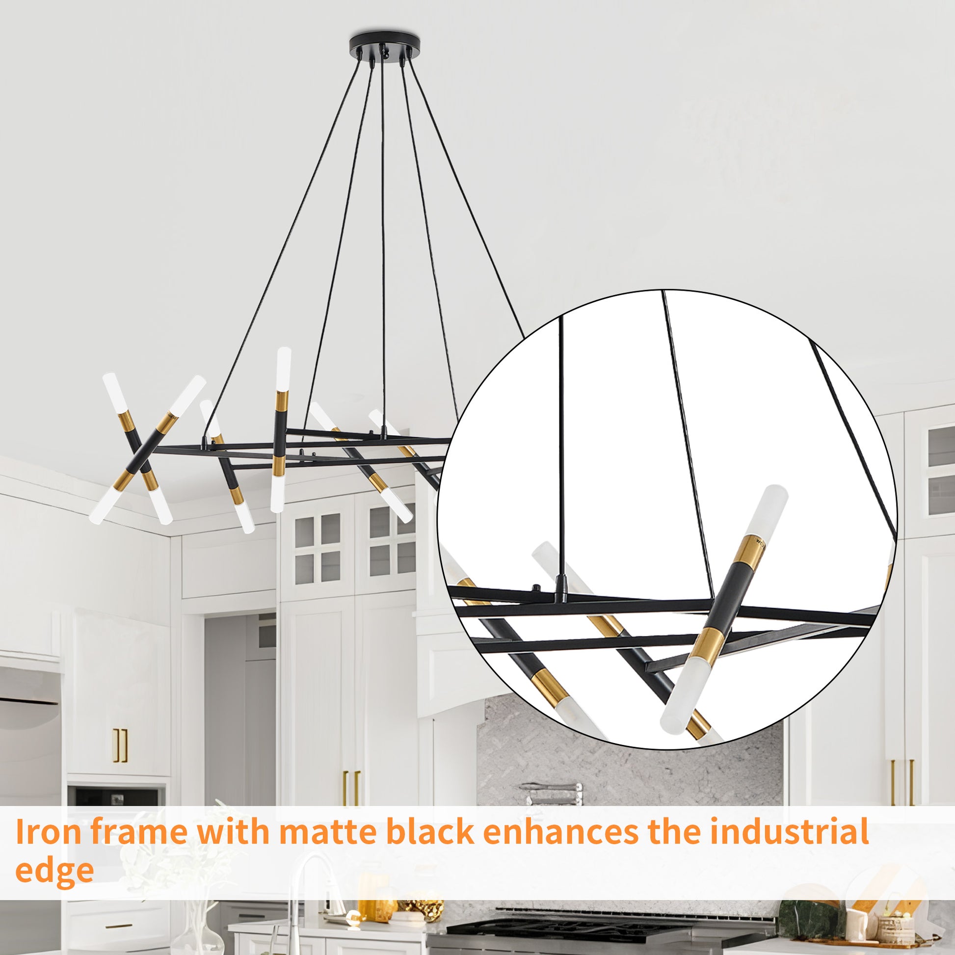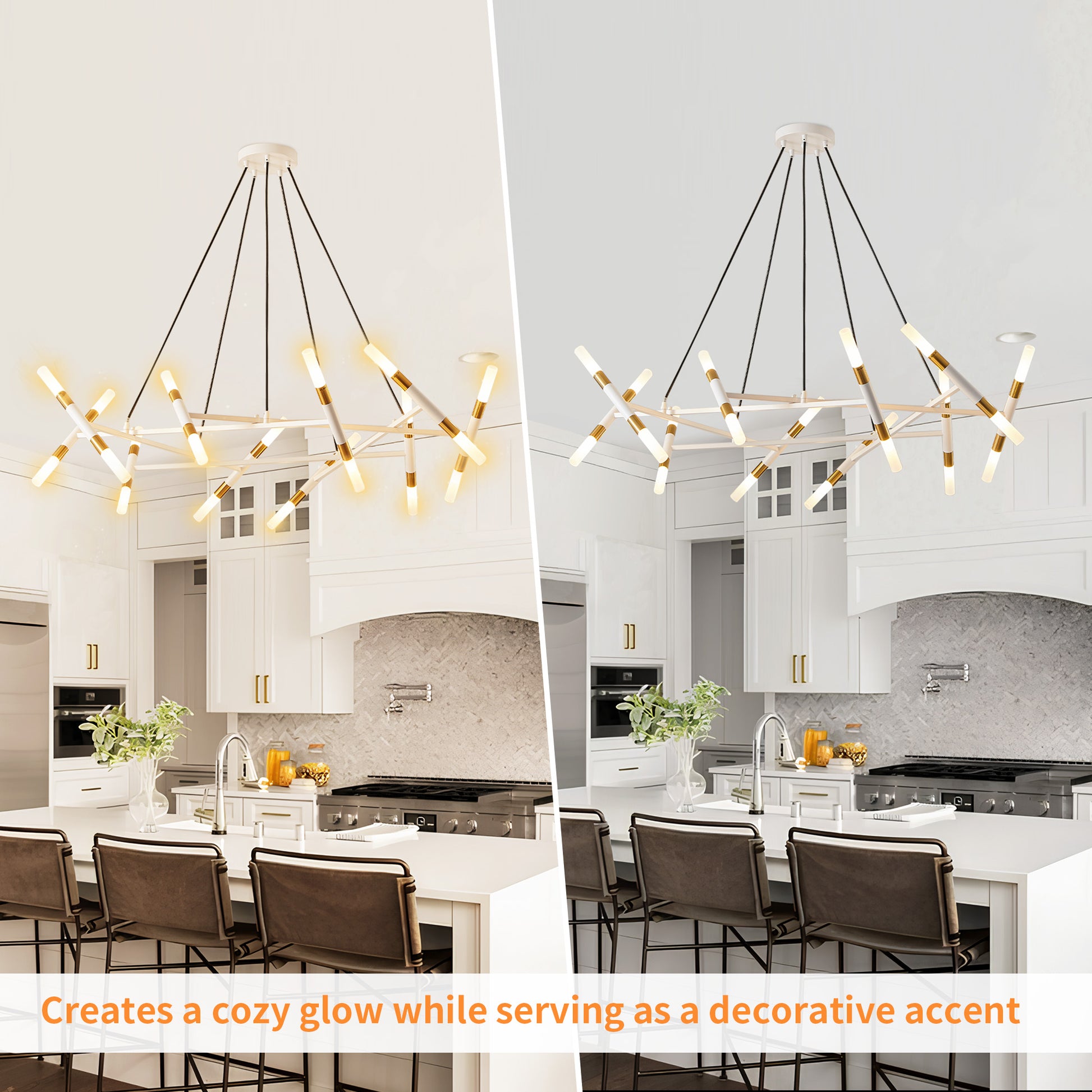 TaiMei 41" Golden Modern Chandelier merges minimalist branch design with matte gold accents, creating a sleek centerpiece for dining rooms, living rooms, or kitchen islands. Crafted from rust-resistant metal and frosted acrylic shades, its durable construction withstands daily wear while diffusing warm, gallery-style lighting. The adjustable black cords adapt to most US ceiling heights, complemented by energy-efficient G9 bulb compatibility (20x3W, 2700K recommended). The adjustable chain ensures the perfect fit for any ceiling height, and installation is quick and easy with clear instructions.UL-certified hardwired design ensures safety, ideal for homes or boutique cafes.