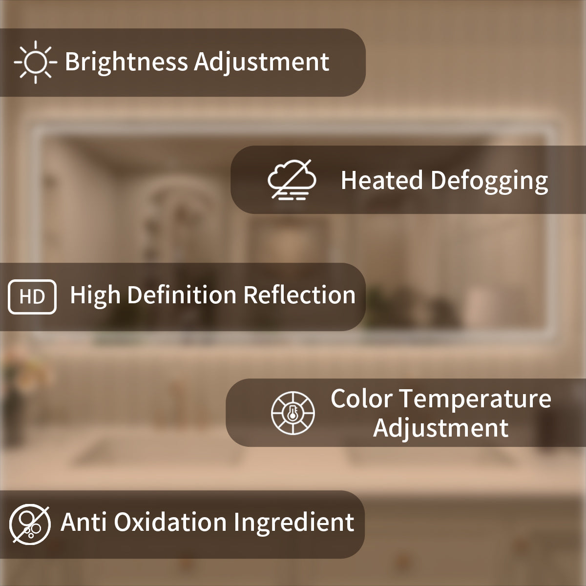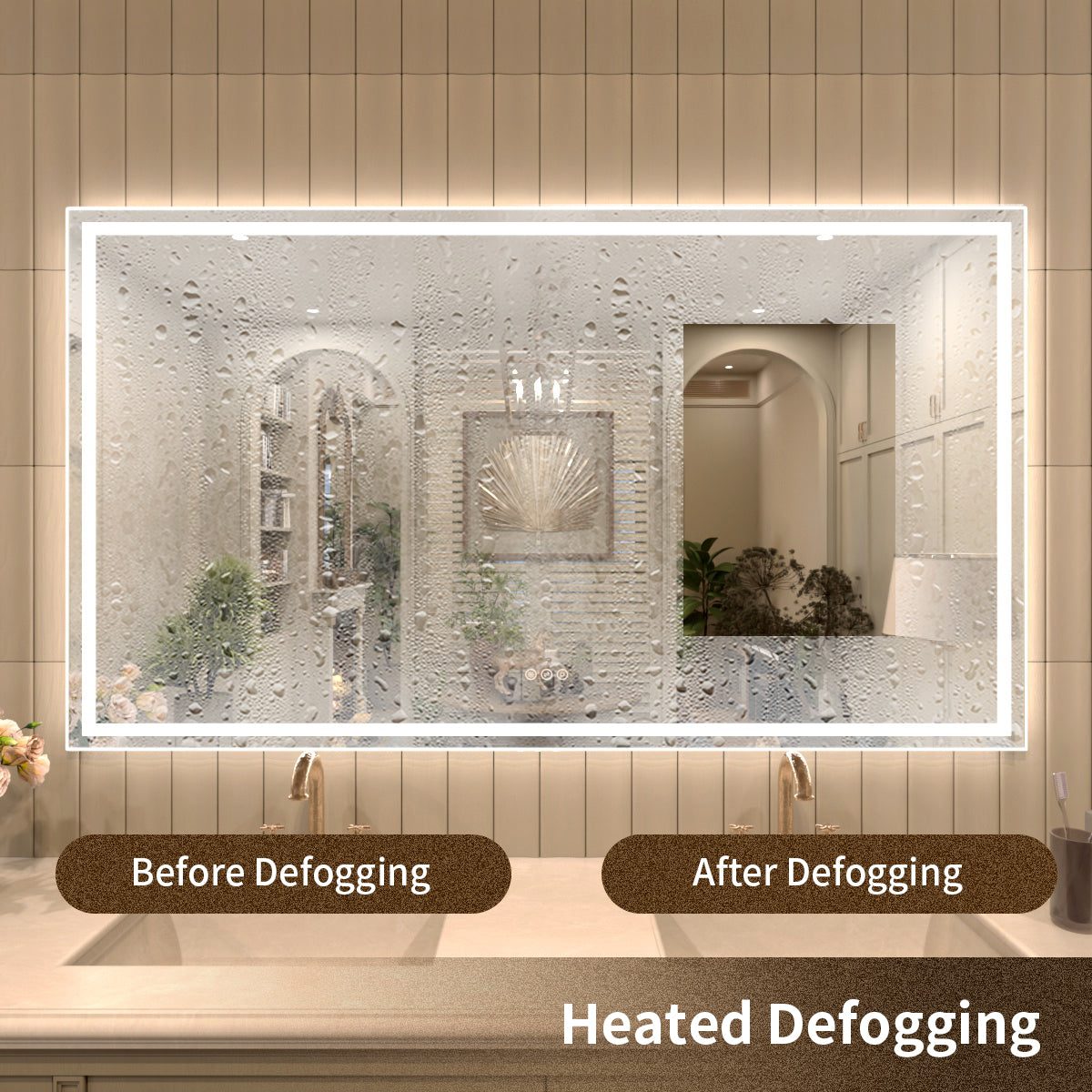Looking to add a touch of modern luxury to your bathroom? Discover FOCA US's TaiMei LED lighted mirrors. These innovative mirrors enhance traditional vanity designs and come with comprehensive ETL and cETL certifications for your peace of mind. TaiMei mirrors feature high-quality tempered glass and a premium LED lighting system, ensuring lasting quality for generations. Tempered glass is safer as it shatters into small pieces if broken, reducing injury risk, and its heat and impact resistance make it ideal for humid environments. The smooth surface prevents moisture buildup, making it easy to clean. The user-friendly dimmable control system, conveniently located on the lower front, allows you to easily adjust brightness and color hue to create the perfect ambiance. Upgrade your space with TaiMei—where functionality meets elegance.