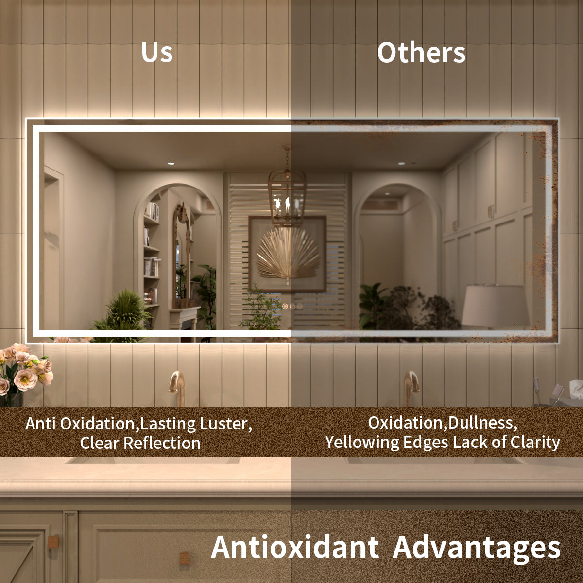This mirror is designed for versatility. With its modern and elegant style, it works well not just in bathrooms, but also in a variety of other spaces such as dining rooms, living areas, bedrooms, hallways, entryways, and more.