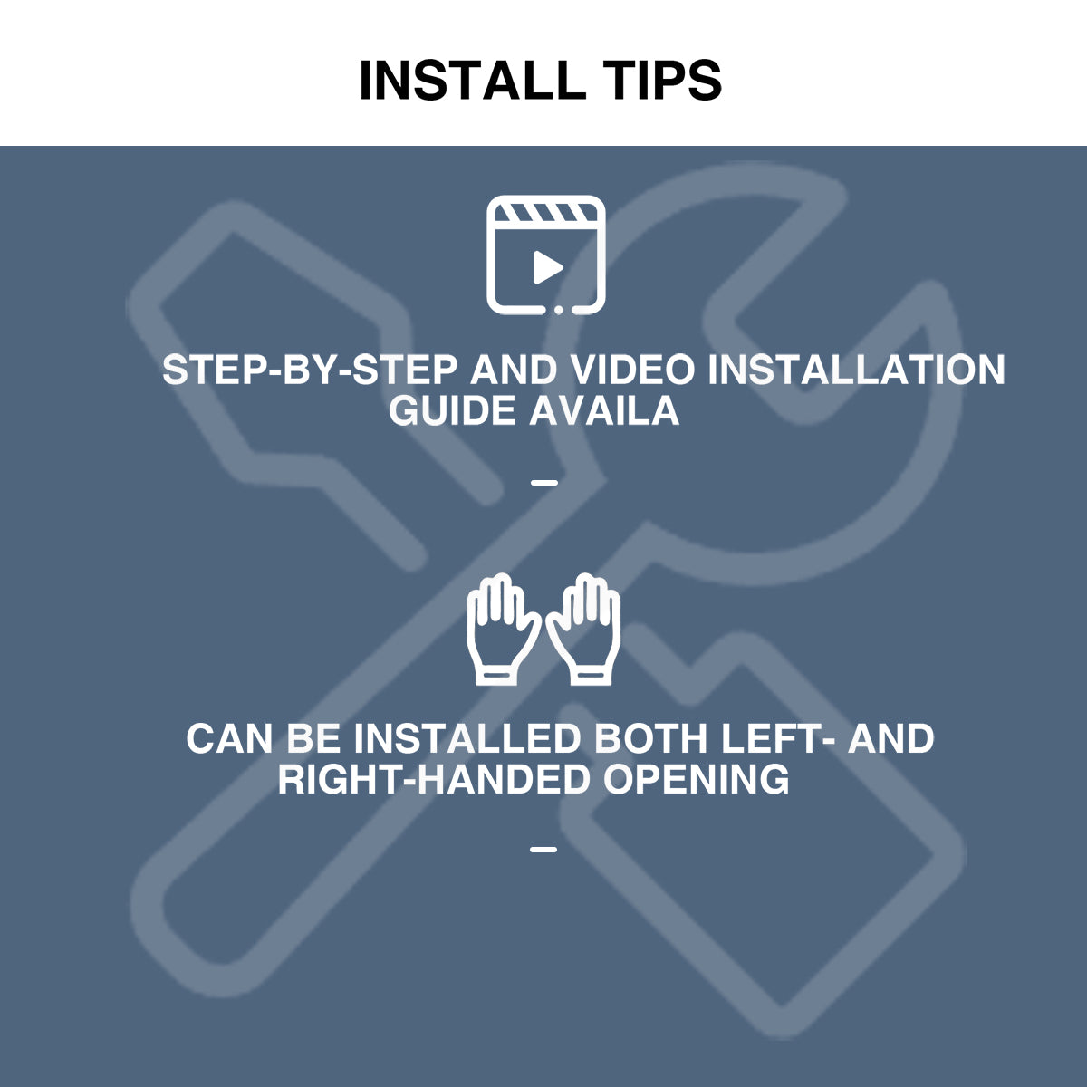 | INSTALLATION NOTE: | Reversible installation is possible. Wall studs or alternative reinforcement are required for proper installation. |