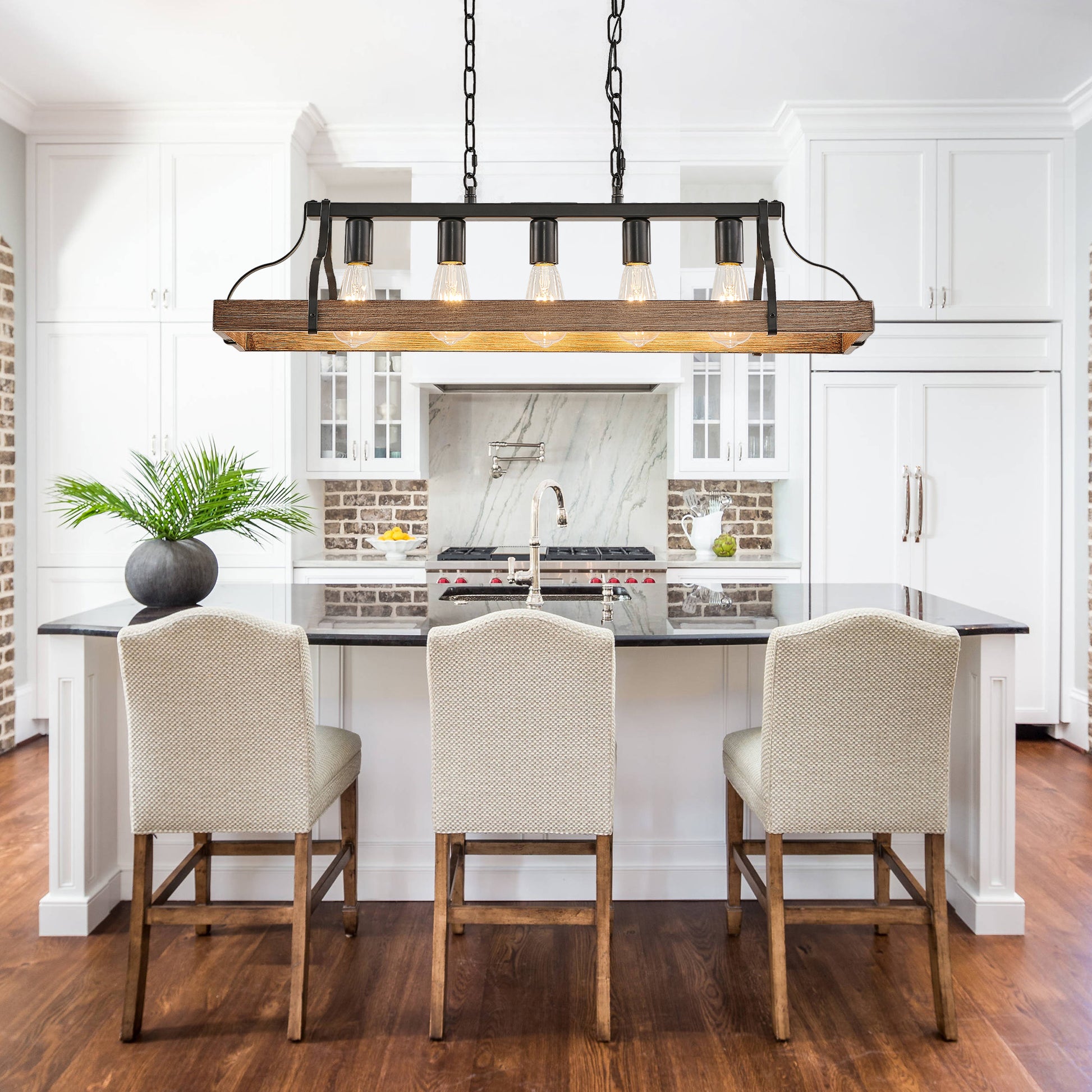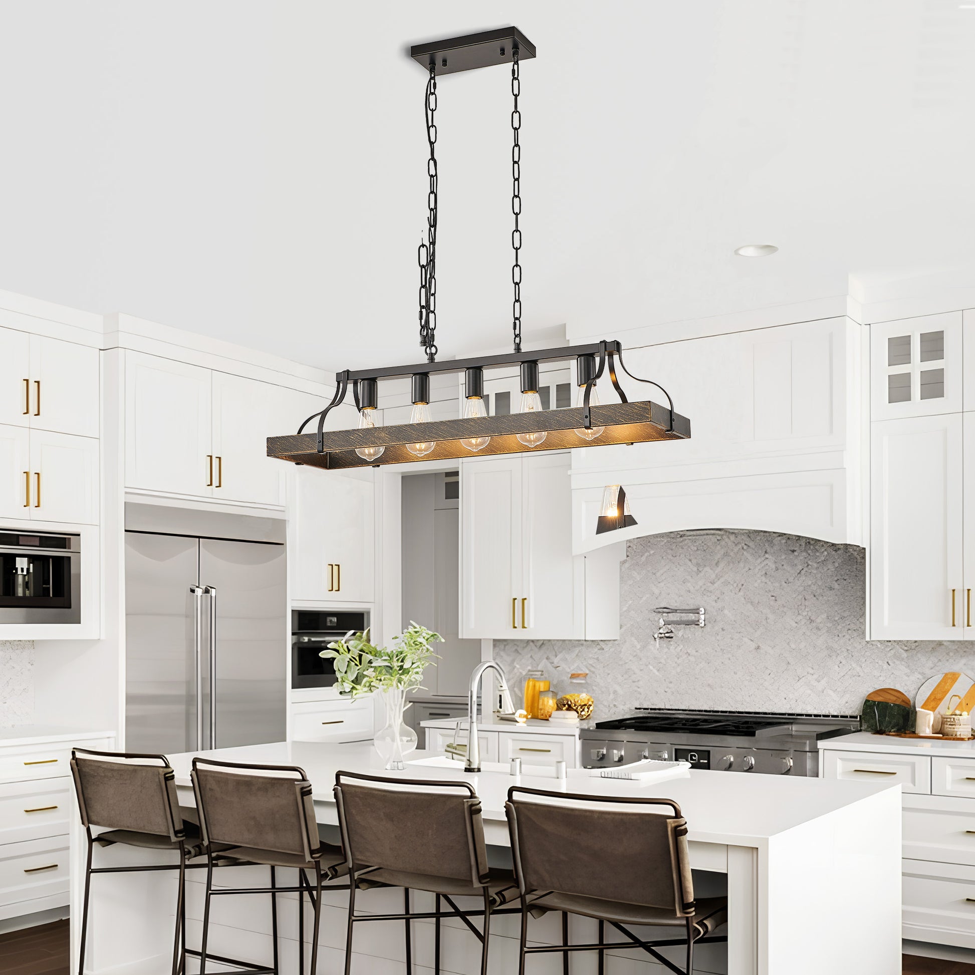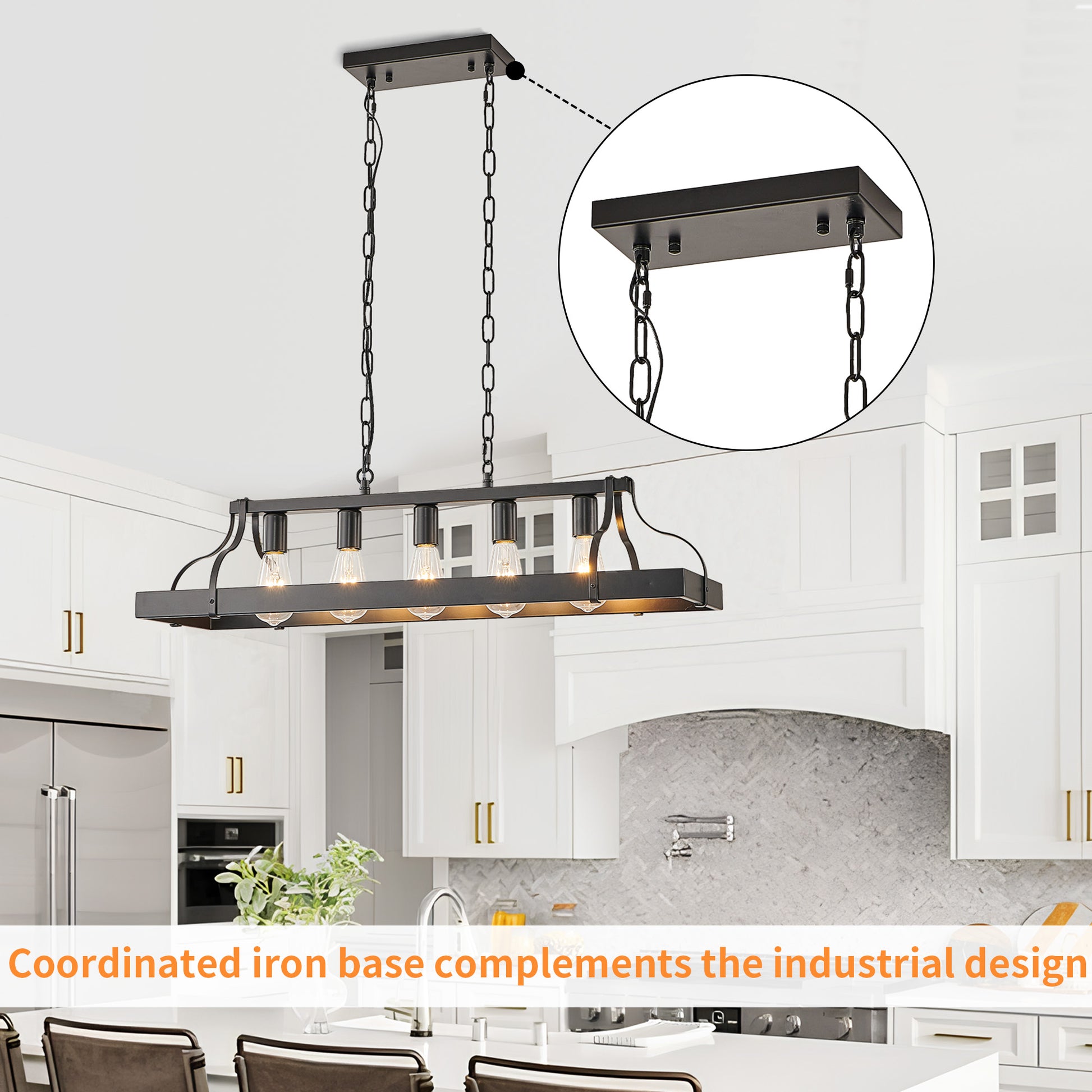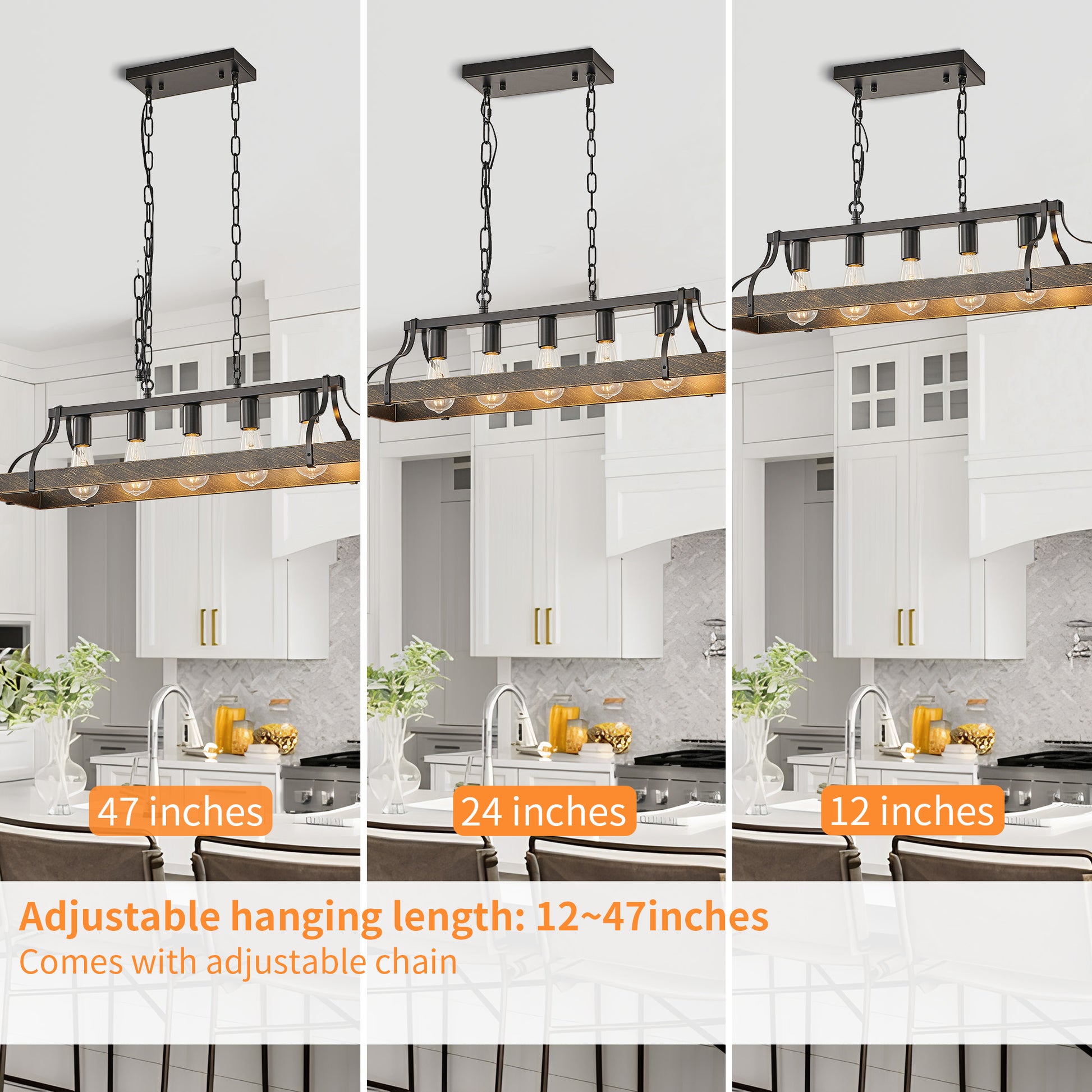 This 34-inch all-black pendant light by Taimei features a sleek industrial design, blending effortlessly into spaces like dining rooms, kitchens, living rooms, or bars. With 5 E26 bulb sockets, it offers flexibility to use various bulb types, providing ample brightness and a warm ambiance. The adjustable hanging chain allows you to customize the height to suit different ceiling sizes. Crafted from high-quality metal with an all-black coating, it resists rust and wear, ensuring long-lasting durability. Easy to install with detailed instructions, this pendant light is a perfect addition to any room.