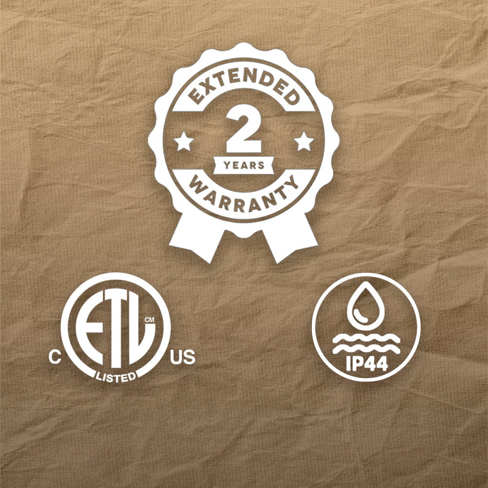 SAFETY: | ETL & cETL certified, IP44 waterproof, and fully enclosed LED lighting for safe use. |