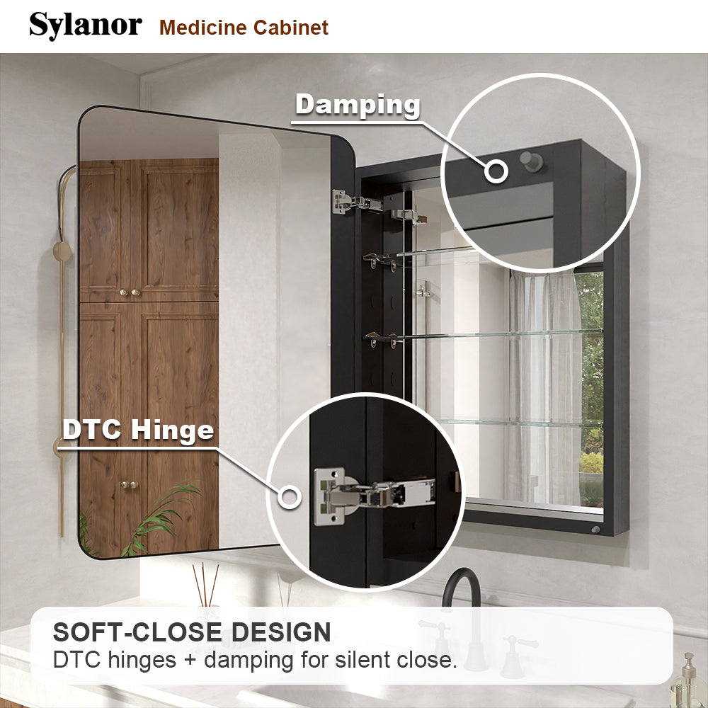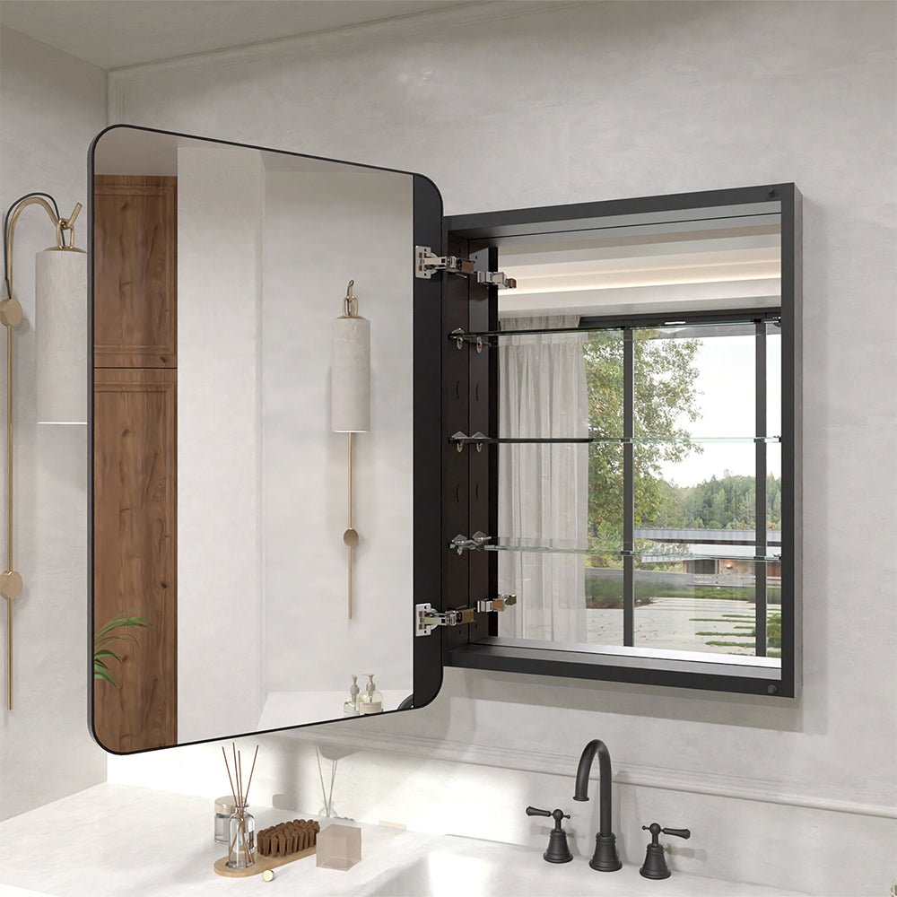 The Verve series framed medicine cabinet is crafted with high-quality tempered glass and an anodized aluminum back frame, ensuring long-lasting clarity and rust-resistant durability. It features soft-close DTC hinges with damping, providing a silent closing experience, and a 105-degree opening angle. With sleek mirrored surfaces both inside and outside, it serves as a versatile choice for bathrooms or powder rooms. It supports wall-mounted/recessed installation and left-/right-hand opening. The Verve series framed medicine cabinet can also be paired with all accessories from the NestPro series to create a complete and cohesive bathroom look.
